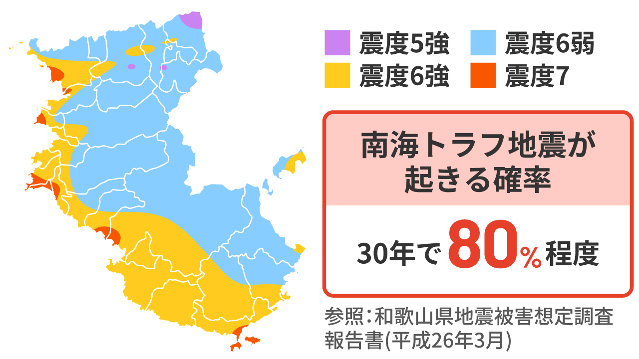 和歌山は南海トラフ地震の想定域に近接し、歴史的にも大きな揺れを複数回経験してきた地域です。周辺では有感地震の観測頻度も相対的に高く、強い揺れや長周期成分を含む地震影響が現れやすい環境にあります。地域特性として、地震リスクが常に意識されるエリアです。